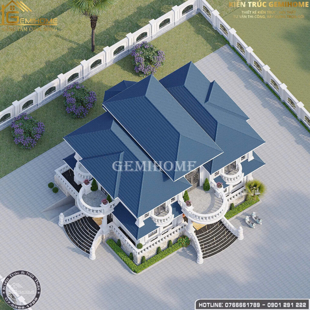 Mái nhà: Mái thái màu xanh nổi bật tạo điểm nhấn cho tổng thể công trình