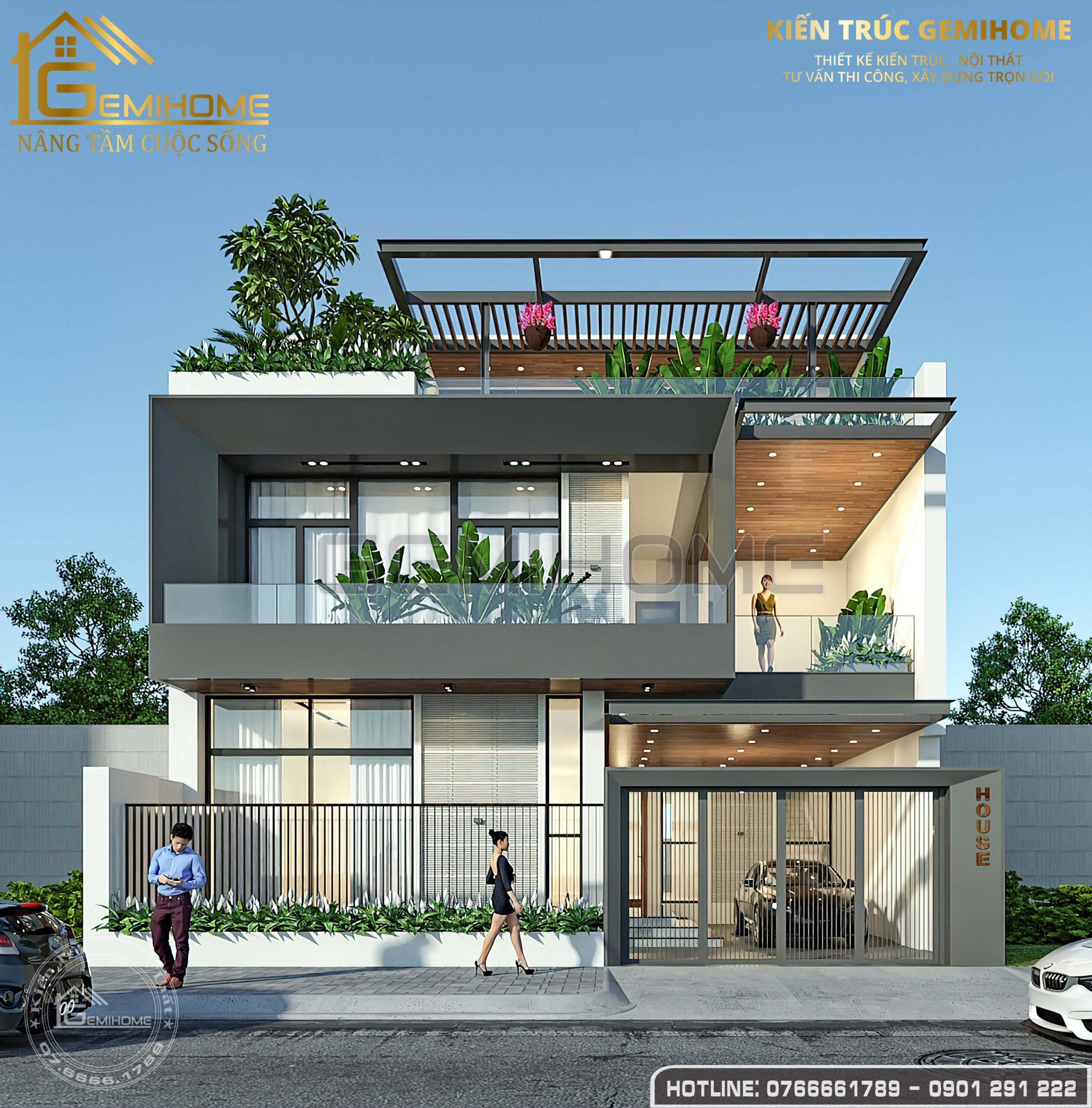 Mang phong cách sang trọng, hiện đại. Nét đẹp hiện đại được thể hiện qua cấu trúc hình khối vô cùng đơn giản nhưng đều được tính toán kỹ càng để đảm bảo các yếu tố nhiệt độ, ánh sáng…Vì là nhà phố có diện tích bề ngang hạn chế nên toàn bộ mặt tiền phía trước được trang trí để làm điểm nhấn cho ngôi nhà. Trong thiết kế này điểm nhấn chính là màu nâu gỗ tự nhiên vừa tạo cảm giác hài hòa khi cân bằng sắc trắng, vừa tạo nên ấn tượng sang trọng cho tổng thể thiết kế.
