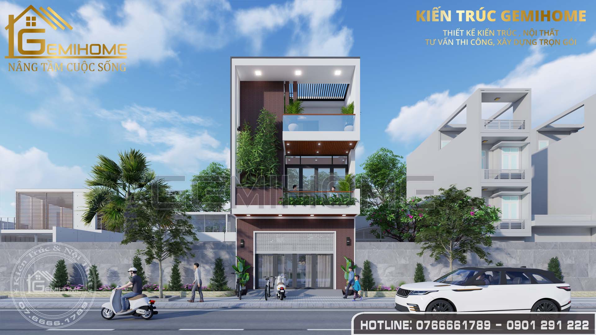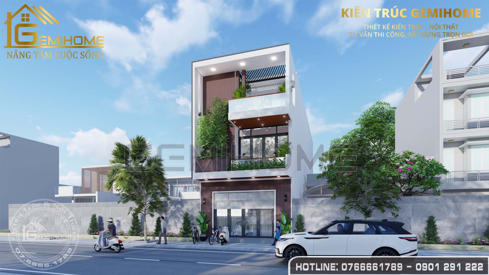 Được thiết kế theo nhu cầu của anh Hoàng muốn có 1 ngôi nhà theo phong cách hiện đại đẳng cấp nhưng phải gần gũi với thiên nhiên, không gian sống “xanh “. Kiến trúc sư Gemihome đã khéo léo lồng ghép giữa từng đường nét kiến trúc. Và vật liệu để mang đến một ngôi nhà vừa hướng đến sự đơn giản nhưng vẫn toát lên sự hiện đại tươi mới với nhiều cây xanh trong 1 không gian hạn chế mặt tiền 5m
